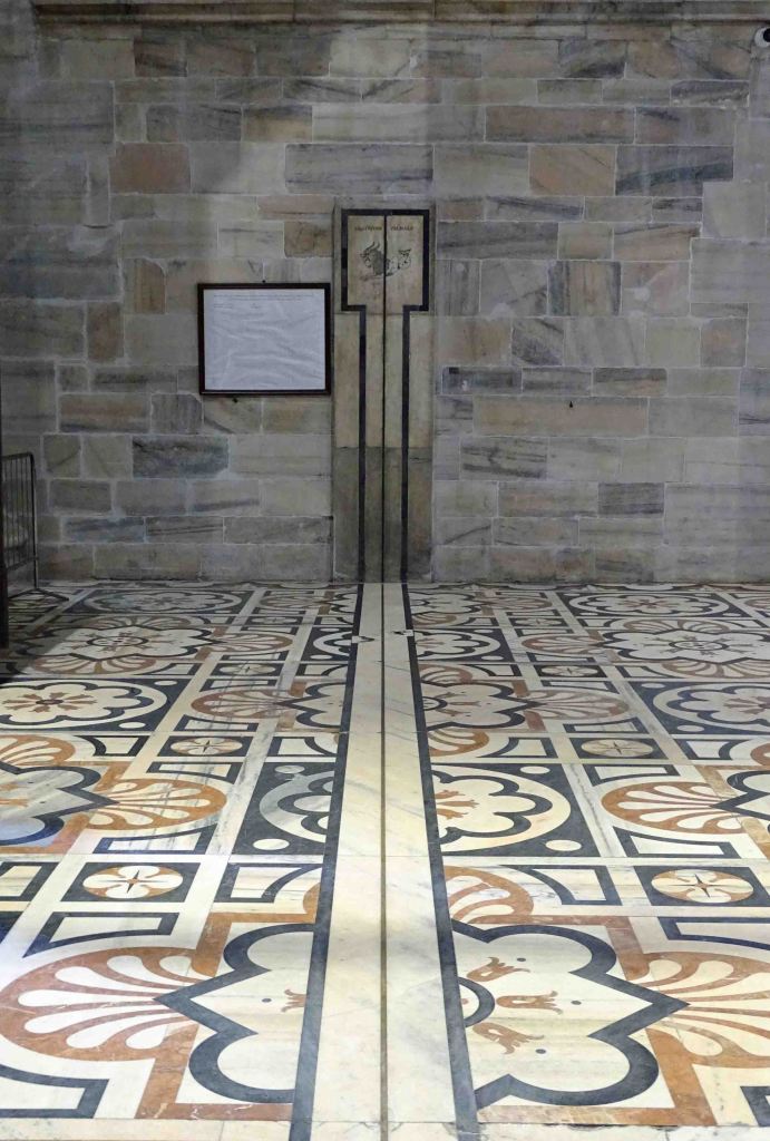 This was the 3rd time we have discovered a meridian line on the floor of an Italian church. The meridian line on the floor of the Duomo is an inlaid thin brass band, along with the 12 astrological signs of the zodiac. It was built in 1786 by astronomers from the Brera Observatory. The line crosses the width of the church but at the north end, the line continues nearly 10 feet (3 m) up the wall, because the floor was not wide enough. A hole in the roof near the south wall, each day at noon, casts sunlight on a different spot along the line. Depending on the time of year and the rotation of the earth, the sun will touch every part of the meridian line. It is quite amazing to witness.