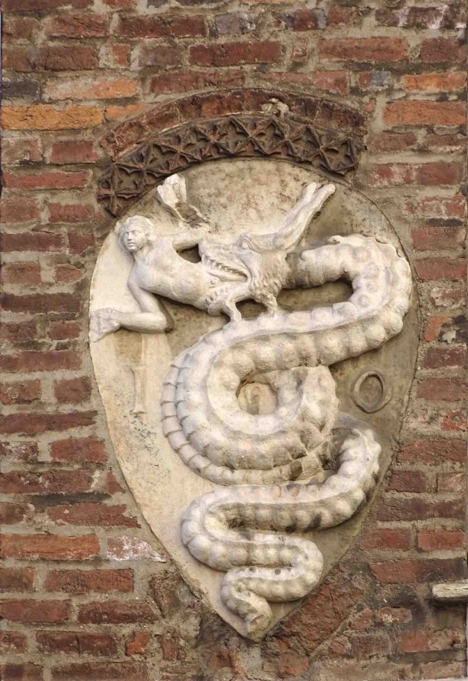 The biscione is a large serpent or dragon seen in the act of eating a human (usually thought to be the enemy). The coat of arms once belonged to the House of Visconti and the historic emblem has become a symbol of the city, often used as a marketing tool by Milanese based companies.