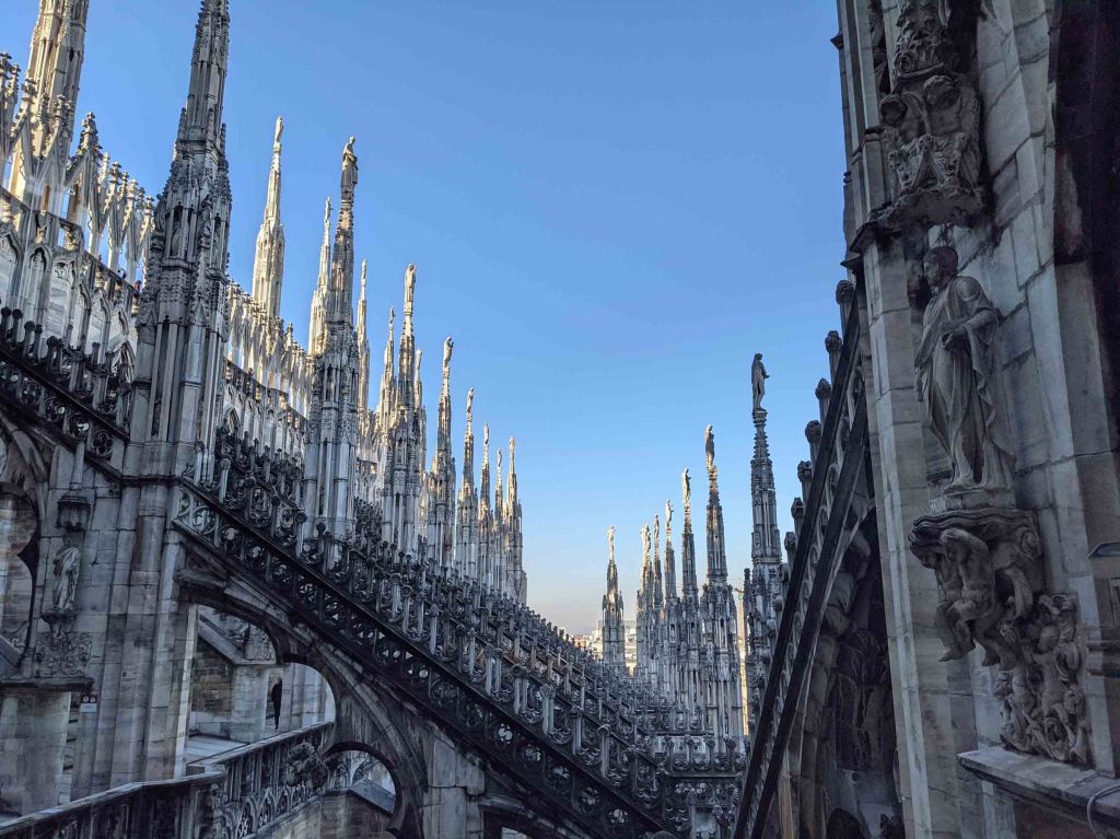 In 1867, American writer Mark Twain visited Milan’s Cathedral and rooftop and he wrote: “What a wonder it is! So grand, so solemn, so vast! And yet so delicate, so airy, so graceful! Away above, on the lofty roof, rank on rank of carved and fretted spires spring high in the air, and through their rich tracery one sees the sky beyond. They say that the Cathedral of Milan is second only to St. Peter’s in Rome. I cannot understand how it can be second to anything made by human hands.”
