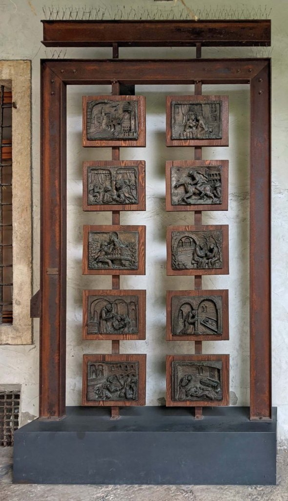 We found these 10 poignant bronze panels that depict the story of Romeo and Juliet. Each panel is named and is a memorial scene, including the same panel of Romeo escaping to Mantova that is on the wall of his home.