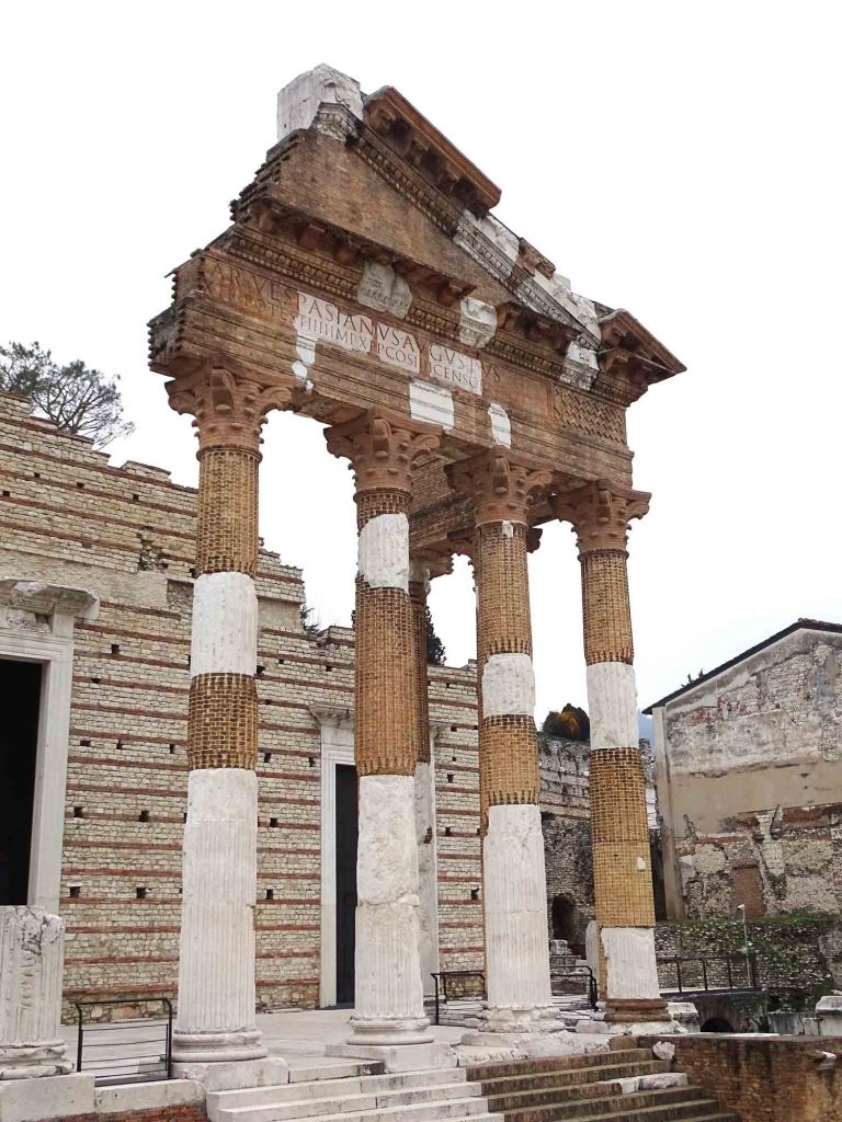 The Temple of the Capitoline was the main temple in the Roman town of Brixia (Brescia). Today the ruins are part of an archeological site which includes a Roman amphitheatre that seated 15,000 and a museum. Out front is a partial portico made of Corinthian columns where a dedication to the Emperor Vespasian can still be seen.