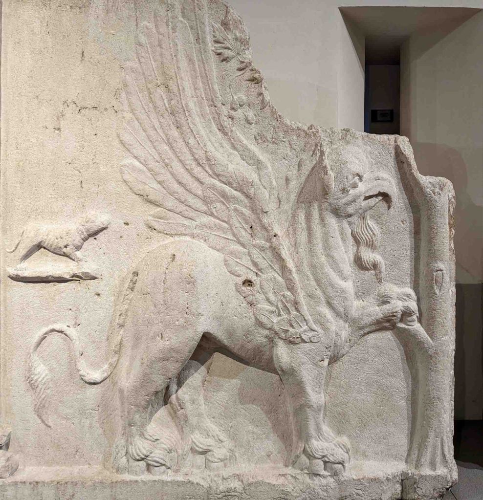The 12th century Basilica of San Salvatore was built within the complex and served as a chapel for the monastery. The Church of Santa Giulia was built between 1593 and 1599 and Santa Giulia’s beautiful interior is decorated entirely with painted frescoes. Various funerary monuments are displayed and a 2nd century CE carved stone griffin caught our attention. The griffin was sacred to Apollo and the Sun God and it represented the ascent of the deceased to the gods. Next to the griffin is the tree of life.