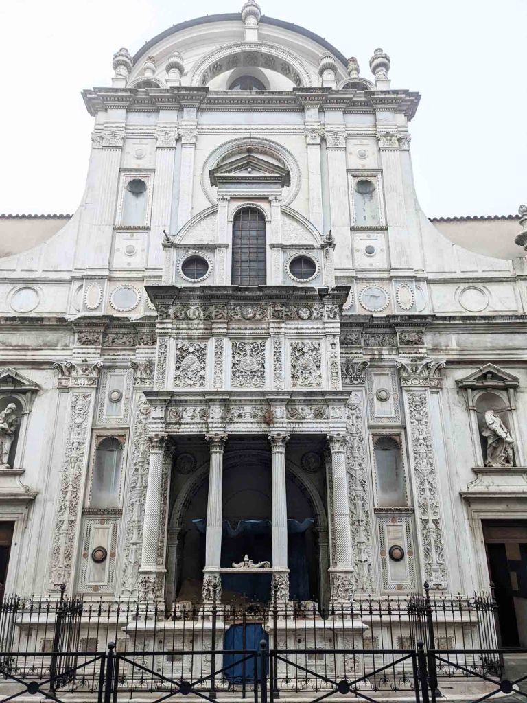 The marble carved details of the exterior of the Church of Santa Maria are ornate and quite stunning. Although a smaller church we thought the interior walls, ceiling and pillars were even more impressive than the exterior; and it has an interesting backstory.