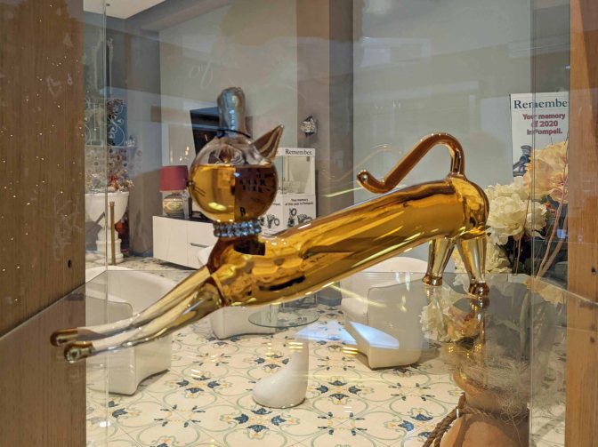 You may have heard of the Italian alcoholic beverage called Grappa that contains 37.5% to 60% alcohol by volume. Producing grappa fits perfectly in our world today with our focus on reusing, recycling and reducing waste. Grappa production has zero waste. This fragrant, grape-based brandy is made by distilling the pomace (grape seeds, stalks and stems) leftover from the wine-making process. This very striking cat shaped glass bottle of grappa was displayed in our hotel foyer.