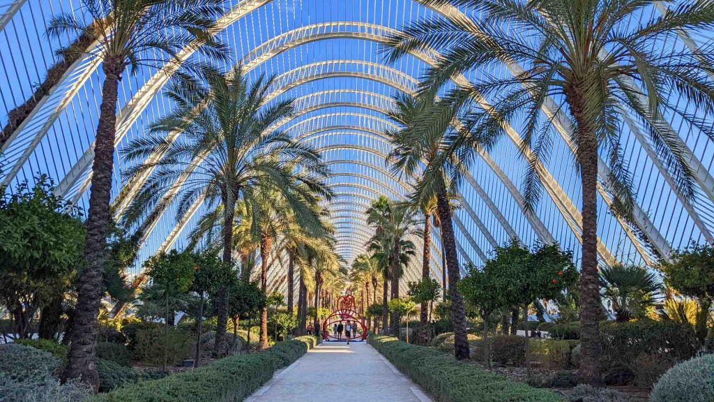 And finally, nearly every time we visit Valencia we plan a visit to the Ciutat de les Arts i les Ciències, (the CAC) and in english, City of Arts and Sciences. This structure is part of the complex and is called L’Umbracle. It is a sculpture garden with plant species indigenous to Valencia. This structure, like the rest of the CAC, was designed by Santiago Calatrava.