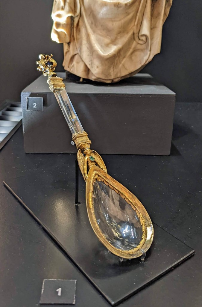 We admired the stained glass windows with scenes that represent the months of the year. We have visited many similar museums but we always seem to find a few stand-out pieces. There was an intricate buckle plate from the 7th century made from bronze damascened with silver and niello (a black compound of sulphur with silver, lead or copper used for filling in engraved designs) and this tiny 15th century 3″ (7cm) long communion spoon made of gilded silver and rock crystal and decorated with a brilliant green stone and deep blue pearl.