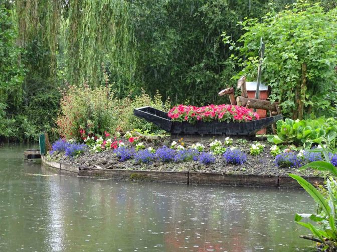 The boat is called a horn boat, because it has a flat bottom and to avoid damaging the banks, both ends are raised up. The boats are silent and the boatman/guide occasionally and quietly shared (in French) his knowledge about the history of the hortillonnages. The header picture at the top of this writing is an artist rendering of a horn boat and the photo below is a small horn boat in the garden but it shows the horn boat’s unique shape.