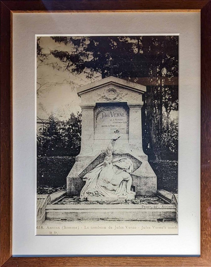 Throughout the city and parks are placards with interesting pictures and mini stories of Jules Verne’s personal history in Amiens as well as some of his fictional characters. On the outskirts of the city, in Cimetière de la Madeleine, is Jules Verne’s final resting place. The sculptor, Amiens born, Albert Roze, created this beautiful, recently restored, gravestone.