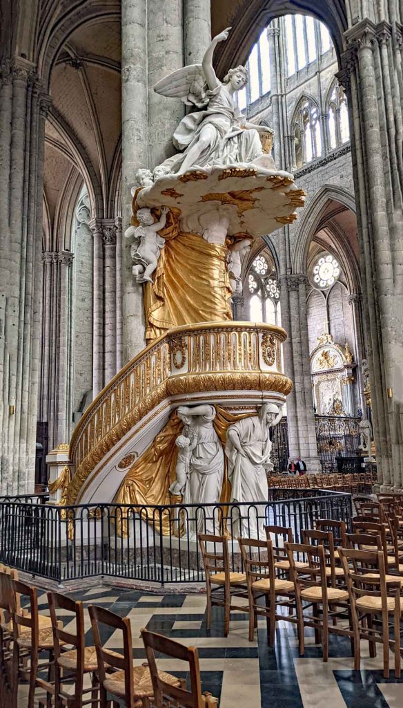 The remarkable interior includes the extraordinary gold and white pulpit created in 1773; the eye-catching black and white stone labyrinth inlaid in the floor in 1288 where pilgrims would walk the labyrinth as part of their pilgrimage; the brilliant red and blue stained glass chapels; the delicate looking wrought iron works; the brilliantly carved wooden choir screens from the 1500’s; the early 16th century choir stalls, adorned with thousands of miniature sculptures and reliefs representing stories from the Old and New Testaments, to name our favorites. This Cathedral has much to offer.