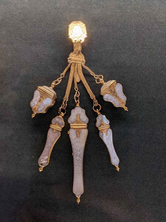 Wikipedia definition: “A chatelaine is a decorative belt hook or clasp worn at the waist with a series of chains suspended from it. Each chain is mounted with useful household appendages such as scissors, thimbles, watches, keys, vinaigrette, and household seals. This beautiful chatelaine has a lovely case for each object.