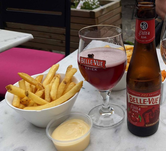 Cafes spill out onto the sidewalks in Belgium just like the rest of Europe. Walking past the tables is a great way to see what patrons are eating or drinking and we had seen, on a number of occasions, red beverages poured into glasses with a beer shaped bottle sitting next to them. We learned it was ‘fruit beer’, so on our final night in town we tried a cherry beer. It was lovely and thirst quenching with only 4% alcohol content. Initially manufactured in Belgium, fruit beer is now available worldwide.