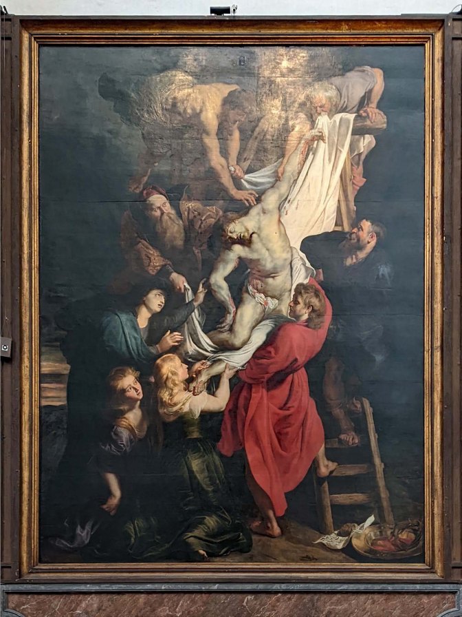 Flemish artist, Peter Paul Rubens, (1577-1640) lived and worked in Antwerp and is considered one of the most important and influential artists of the Baroque era. His large statue stands in the center of the square right out front of the Cathedral. Perhaps best known for his mythological paintings of voluptuous nude females (from which the term “rubenesque” arose), the artist also created significant religious works. It is relatively easy to find Rubens art in churches.