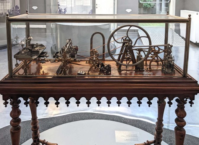 The 1920 Belgian Jewellers Association catalogue showed a 1893 miniature diamond polishing factory belonging to Paul Wijngaard and the same mini-factory was on display in the temporary museum. It is a fully working factory, albeit tiny, with a cutting table, an Edison motor that drives the polishing table and numerous other moving parts.