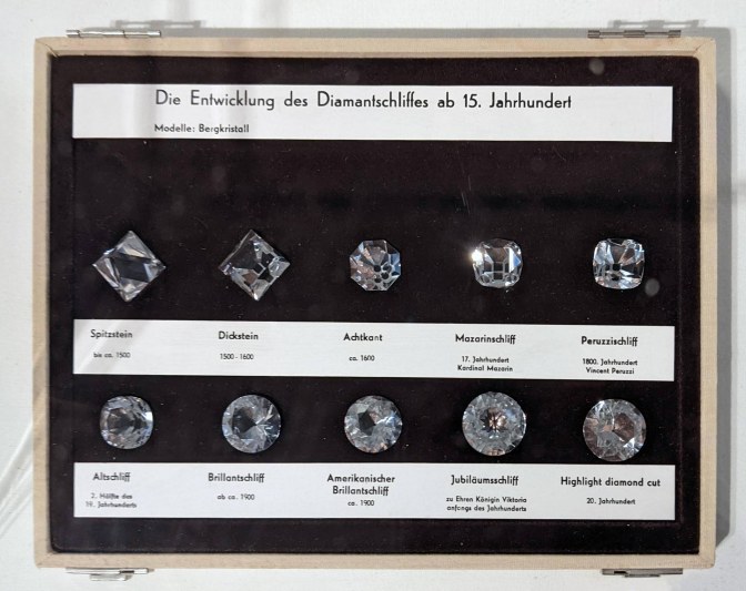 The tray below showing the progression of diamond cutting over the centuries was interesting. Starting in the top left corner with a simple 15th century cut (Spitzstein-sharpened stone) through to the bottom right hand cut from the 20th century, the multi-faceted Highlight diamond cut.