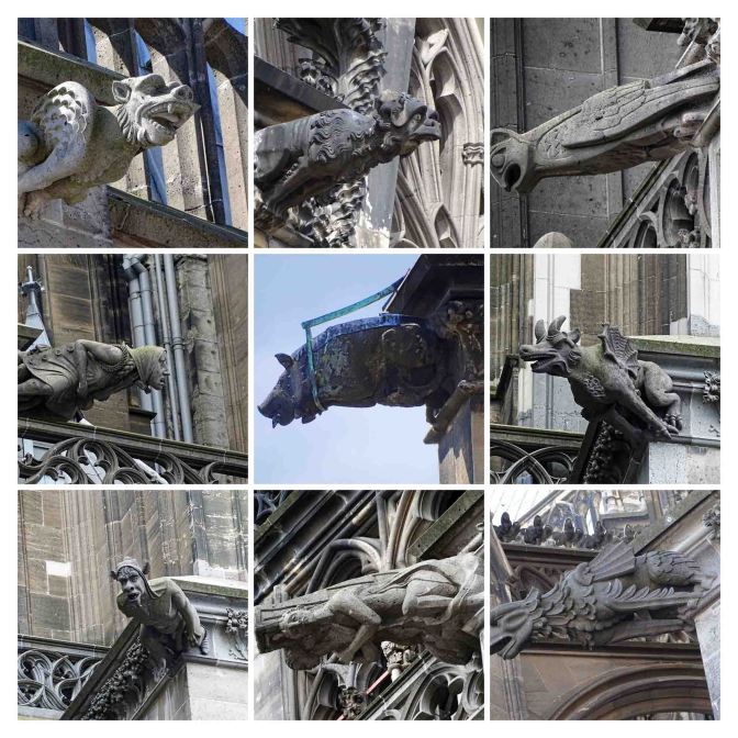 Gargoyles on churches generally attract our attention – there are such a variety of styles, faces and figures. We recently learned that gargoyles and ‘grotesques’ are said to have the power to ward off evil spirits. They guard the buildings they are attached to and protect those inside. We have seen an amazing variety of churches throughout Europe and in our link to the Cathedral at the bottom are more photos of the gargoyles on Cologne Cathedral.