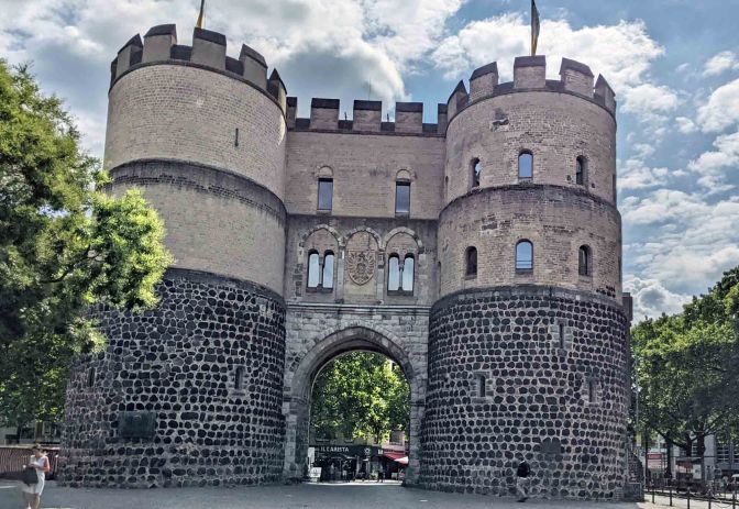 Cologne/Köln was occupied for much of its recent past; first by the French (1794–1815) then it was part of Prussia beginning in 1815 and finally, following WWI, by the British (1918–1926). It was one of the most heavily bombed cities during World War II with estimates between 75% and 90% of Cologne’s buildings destroyed, including the entire 1000 year old city center. By the end of the war only 20,000 residents remained out of the original 770,000 pre-war population. It took a number of years to rebuild the city but by 1959 most of the former residents had returned. Today the population is around 1.1 million. The cityscape is very mixed because only major historic landmarks, like churches and gates were rebuilt. We took this next photo not far from the apartment where we were staying. It is the restored 13th century Hahnen Gate that was a part of the medieval city walls.