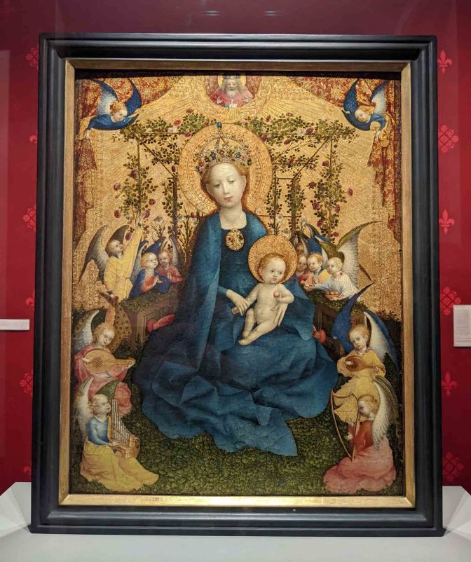 However the Cologne artist Stefan Lochner (1410-1451) painted this outstanding Gothic piece around 1450 and included his characteristic and much more realistic child angels. The Madonna in the Rose Bower is a prized possession of the Wallraf–Richartz Museum.
