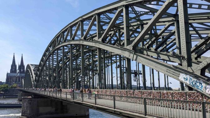 The striking three-arch Hohenzollern Bridge that crosses the Rhine was rebuilt after WWII for rail and pedestrian traffic only. We walked across the bridge to witness, at last count, an estimated 50,000 ‘love locks’ that have been padlocked to the iron grating along the footpaths. Unlike some European bridges, the Hohenzollern can seemingly handle the extra 2 tons of weight the locks have added. Scroll in on our photo to check out the knots of locks.