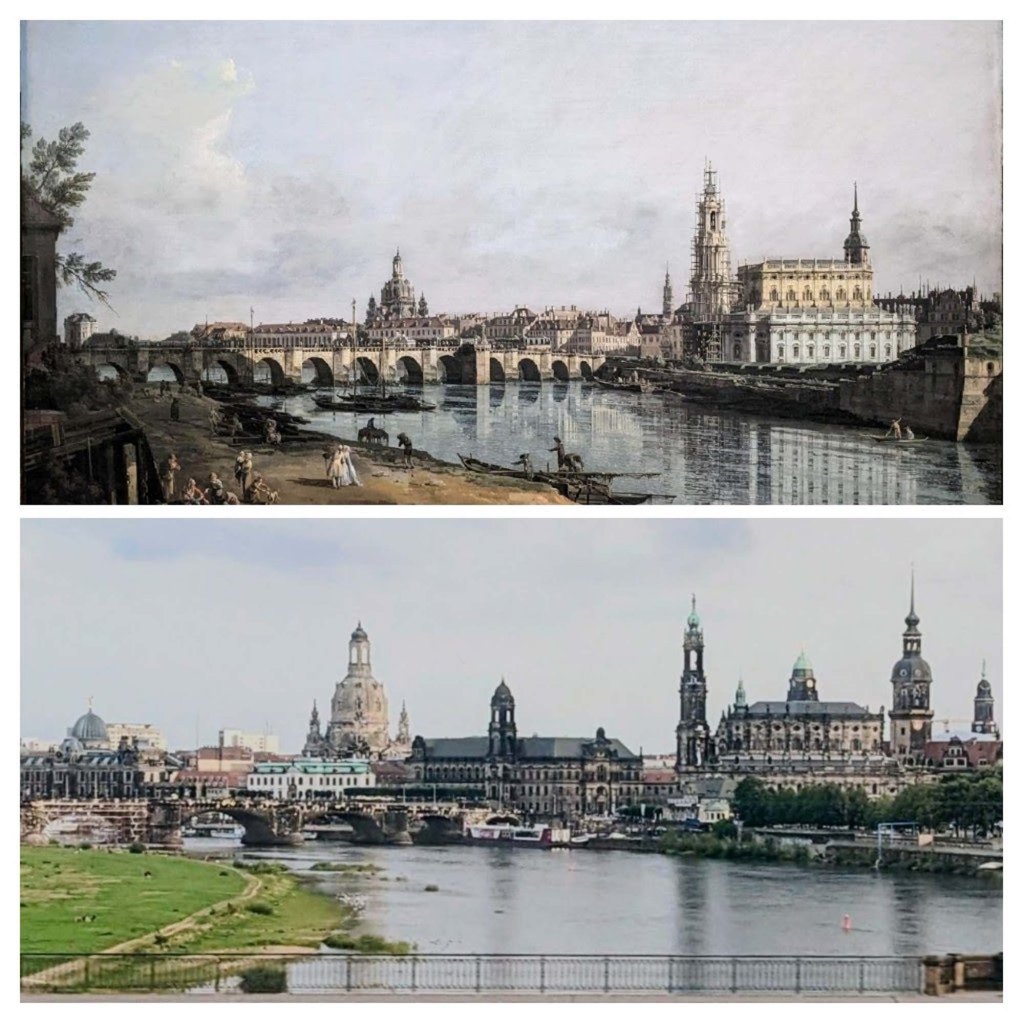 We adored the dozens of Bernardo Bellotto’s intricately detailed paintings depicting the magnificent baroque buildings and daily life of his time. It is thought that Bellotto may have used a camera obscura in order to achieve the precision in his urban views. The collage below has Bernardo Bellotto’s (Canaletto) painting from 1748 called “Dresden from the Right Bank of the Elbe, below the Augustus Bridge” on top and our photo where we attempted to get a similar view taken in 2022 on the bottom.