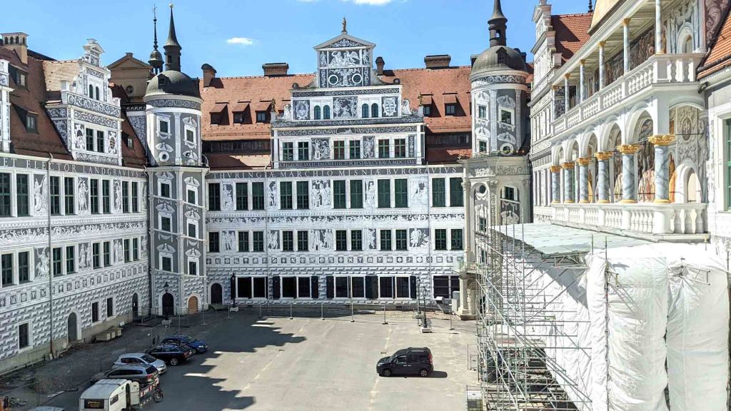 Although the Dresden Castle skyline is striking, the inner courtyard has a special appeal. Contrasting against the dark exterior walls of most of the castle, the large interior courtyard is light, white and bright.