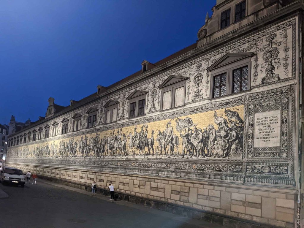 In 1589 in celebration of the 800th anniversary of the House of Wettin, a 335 foot long (102 m) sgrafitti mural was created and named the “Procession of Princes”. After 300 years however, the weather had taken its toll and the patterns had greatly deteriorated. In order to preserve the magnificent wall of detailed artwork, between 1904 and 1907, more than 24,000 porcelain tiles were created in nearby Meissen. The same patterns and designs the original artist had used were painstakingly copied onto porcelain tiles, including 35 princes, kings and aristocrats as well as 59 scientists, artisans, craftsmen and farmers. The magnificent timeline of centuries of faces of the Wettin Dynasty, mounted on their noble steeds is truly beautiful and we are thankful the original sgraffito wall of Procession of Princes has been preserved in porcelain.
