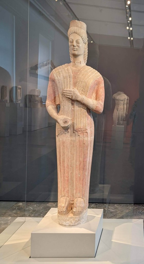 The statue was found at Keratea, Greece (near Athens) wrapped in lead and mostly undamaged. There are remnants of the red color that the statue was originally painted with.
