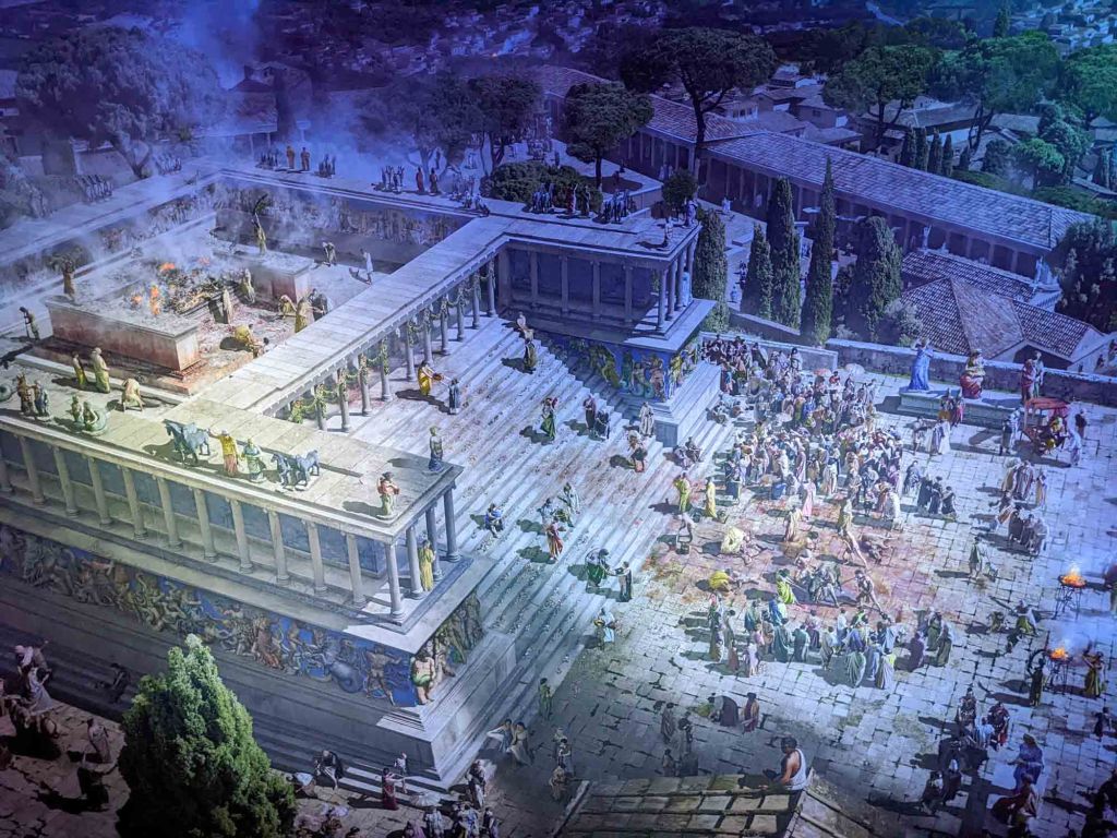 In the 360° spectacular panorama, floor to 100 foot (30 m) high ceiling – we were surrounded by the bustling life in the ancient city of Pergamon in 129 CE. In the center of the room visitors could climb up 4 flights of stairs gaining a different perspective from each floor. We could see and hear realistic sounds of the ancient city coming from the terraces of the Acropolis, temples and theaters, including an image of the famous Pergamon Altar which seemed to come to life. 80 original works of art including statues, painting and friezes were strategically placed against the digital background and lights slowly dimmed and brightened, replicating day to night and back to day. It was an incredible experience.
