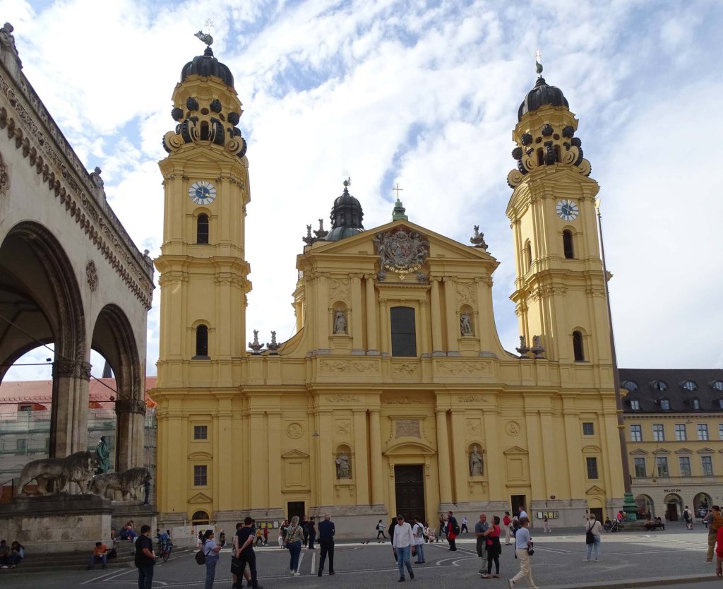The Theatine Church is said to have been built as a thank you gift for the birth, in 1662, of a long awaited heir to the Bavarian crown. The church was built in the Baroque style from 1663 to 1690, but the brilliant yellow exterior, added in 1765-1768, is in the Rococo style.