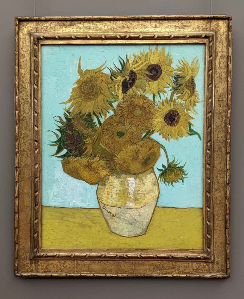 During the renovation of the Neue Pinakothek, there were dozens of fabulous works by the Impressionists on display in the Lower Gallery. Vincent van Gogh apparently created at least 11 paintings of sunflowers arranged in a ceramic vase against a yellow background and we were delighted to find this one.