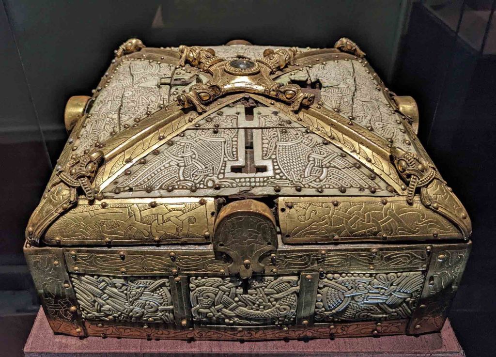 One of the museum’s oldest treasures is the Scandinavian made Box of St. Kunigunde from around 1000 CE. It is made of oak wood, mammoth tusks, ivory and gilded bronze fittings. There are numerous intricately carved birds, animal heads, a partial face and braid-like designs reminiscent of the work of the Vikings on the Box.