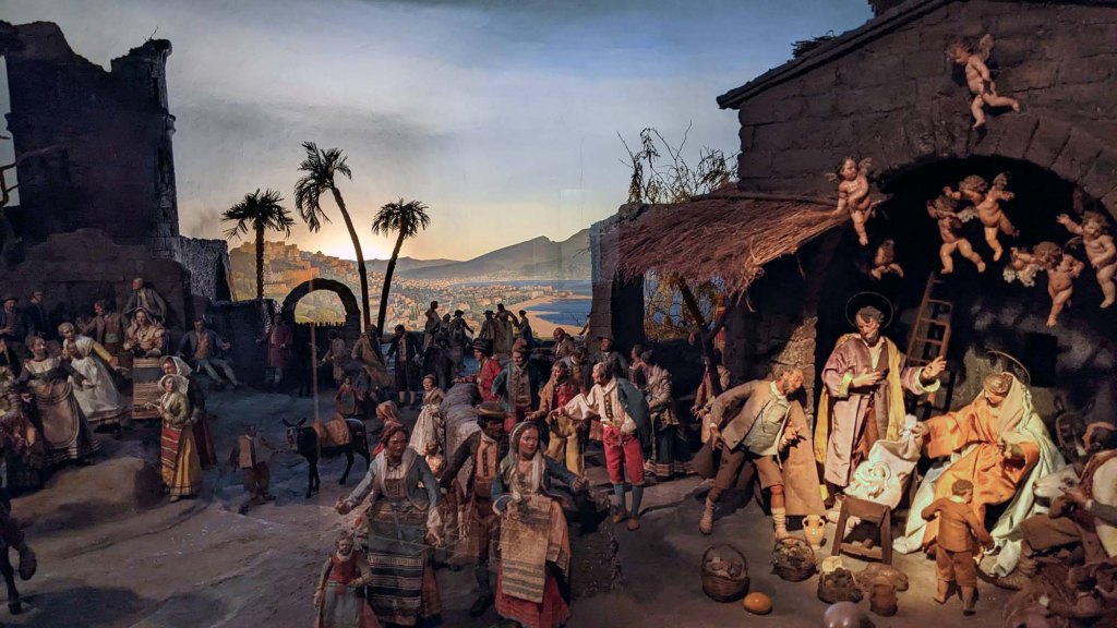 One entire floor displayed countless nativity scenes, each filled with outstanding details. This next photo of a nativity was created in the late 1700’s to early 1800’s by various artists and was named “Adoration of the Shepherds and the People in the Gulf of Naples”. Mount Vesuvius can be seen on the horizon.