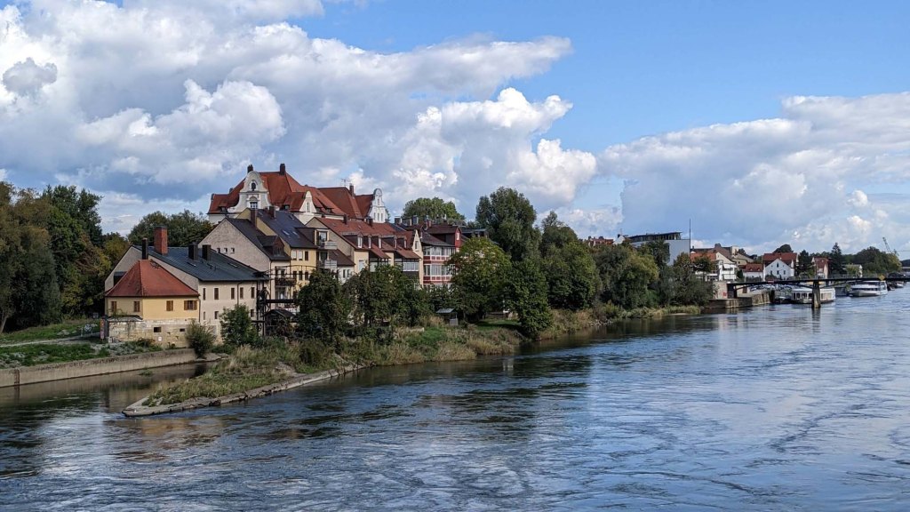 Regensburg, Germany lies at the northern tip of the Danube River where the Danube meets up with the River Regen. By train Regensburg is an hour and half northeast of Munich or an hour southeast of Nuremberg.