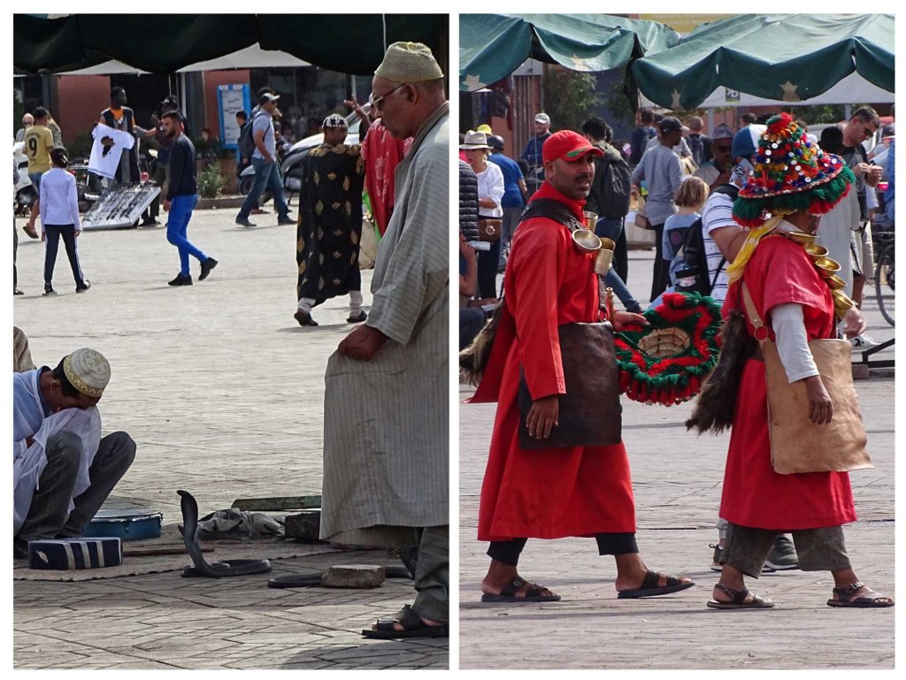 Snake charmers + brightly costumed Gharrib (water sellers)