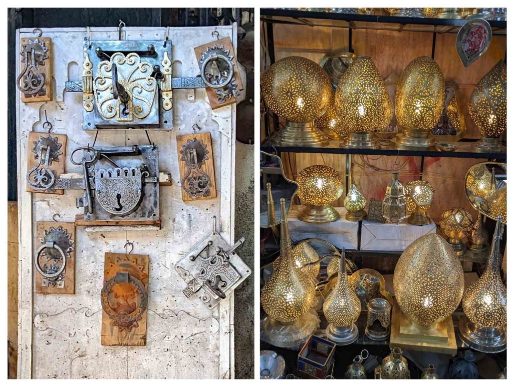 Marrakesh has the largest traditional souk in Morocco and the medina quarter is a UNESCO World Heritage Site. The souks historically are divided into retail areas by craft or trade, a carpet souk, spice souk, metal works souk, leather souk, for example. As we walked through we spotted souks selling cedar wood magic boxes and crafts, carpets and rugs, djellabas, baboush and other traditional Muslim attire, leather bags, intricate locks, lanterns, tea services and silver and brass pieces.
