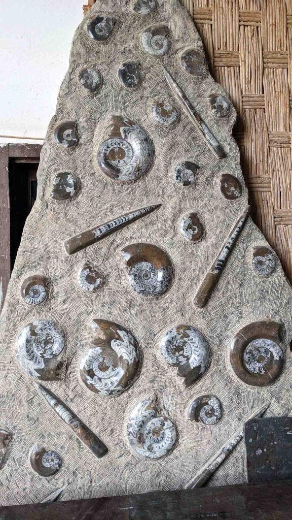 We toured Manar Marble, a factory/shop in Erfoud and were amazed at the thousands of fossils that have been found and continue to be found in the Sahara Desert. Apparently mines and quarries abound in Erfoud where fossils are embedded in huge boulders. It seems ammonites and orthoceras are most common and we saw huge slabs of marble with em edded fossils used for table tops and counters all the way down to beautiful small decor items for the home. Artisans carve out around the fossils to create the 3-D one-of-a-kind pieces.