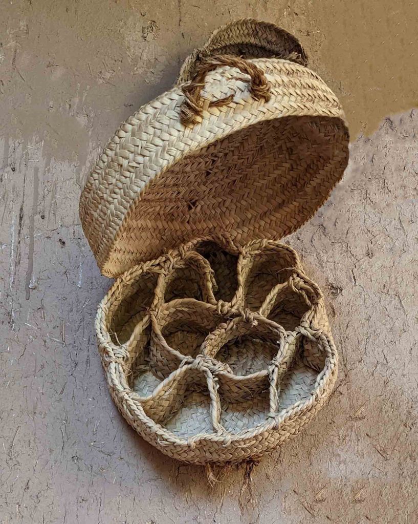 Today much of the kasbah is a museum where we saw local artifacts, traditional dresses, gold coins, manuscripts, tools, an olive press, a bread oven and an old well. This sectioned basket caught our attention. It was a carrying case for a glass tea set. Whenever the camels stopped during a long trek across the desert, tea was made and served in pretty tea glasses that would have been stored in cases similar to this.