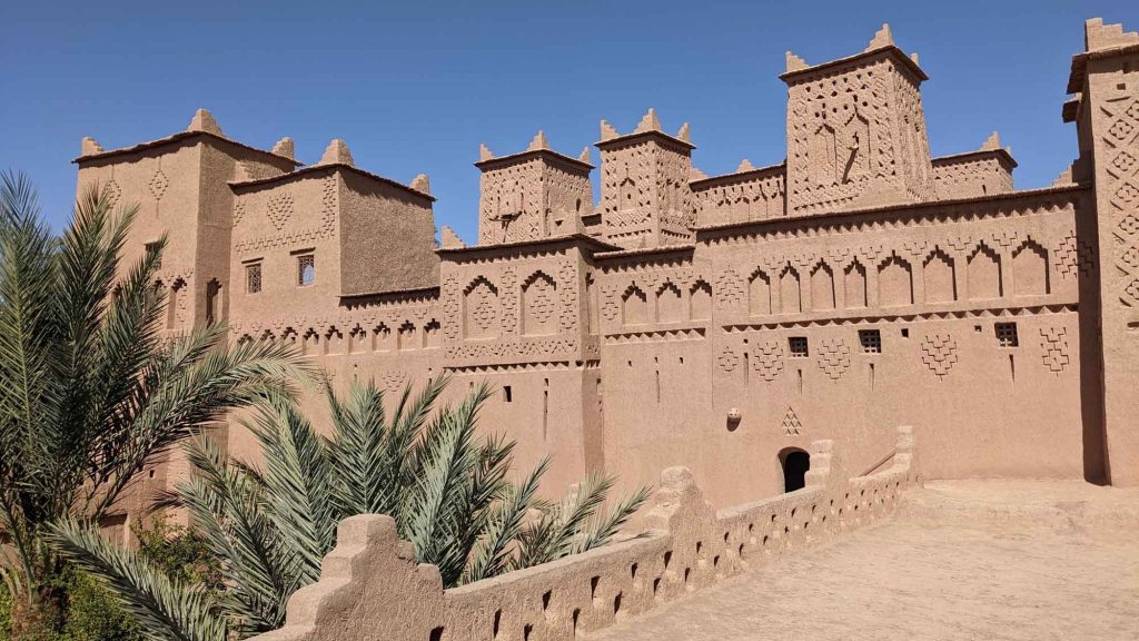 Leaving the M’goun Valley we set off on the ‘Road of 1000 Kasbahs’. There are apparently more than a thousand kasbahs but less than a handful are open to the public. Our first stop was at the Skoura Oasis where we visited Kasbah Amridil, a historic kasbah (fortress or citadel) that was built in the 17th century. The structure is said to represent some of the typical design elements of oasis architecture in the Berber regions of southern Morocco. It is made from rammed earth or mudbrick and the square corner towers are covered in geometric decoration. This striking building was used in the filming of the 1962 movie, Lawrence of Arabia as well as the 1944 version of Ali Baba and the 40 Thieves. Kasbah Amridil was also once used on the Moroccan 50-dirham note.