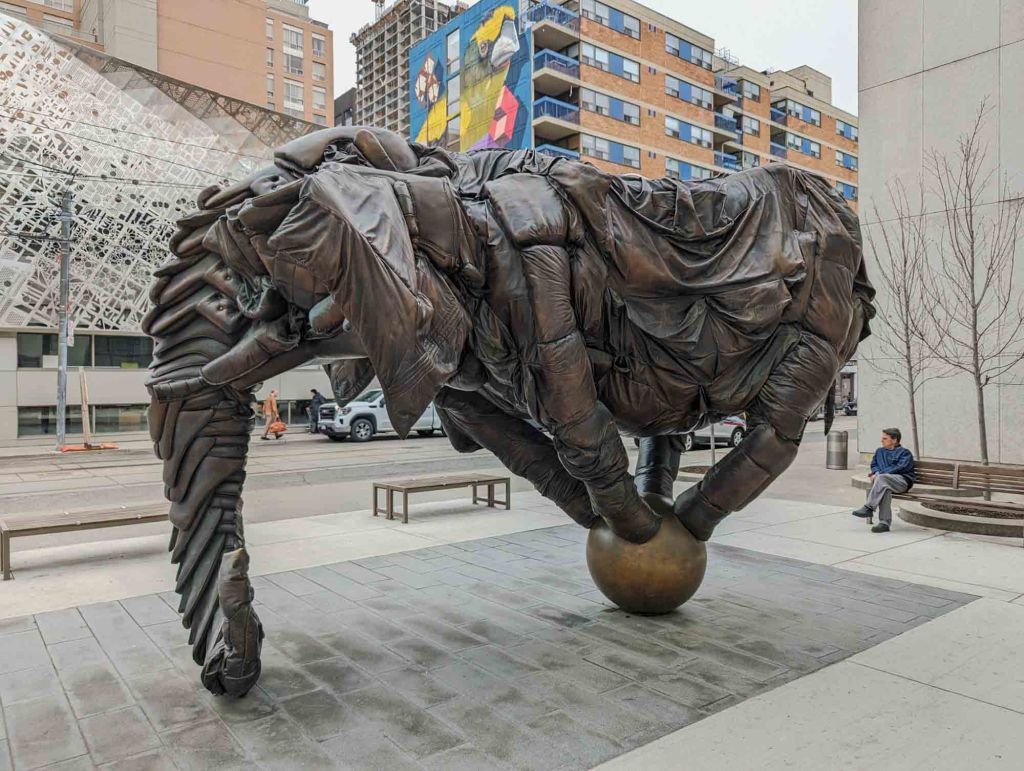 One of the more noticeable pieces is Couch Monster: Sadzěʔ yaaghęhch’ill, 2022 by artist Brian Jungen. The bronze sculpture was modelled from second-hand leather furniture and evokes a performing elephant. The sculpture is 13 feet (4 m) high.