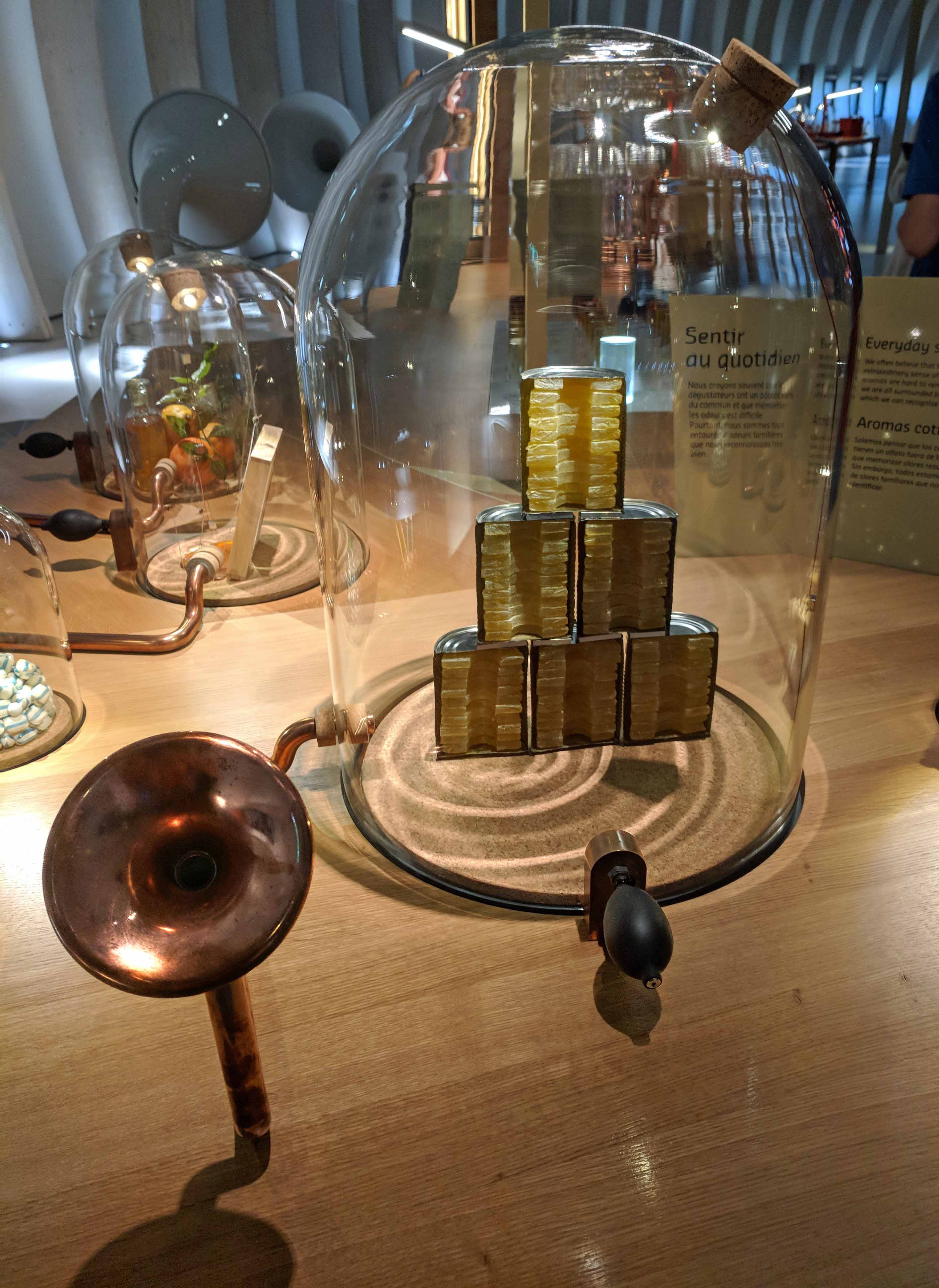 Here you would squeeze a small plastic bulb located at the base of the glass dome. This would then emit the odor of the enclosed element into the copper horn on the bottom left. In this case we were smelling dried pineapple.