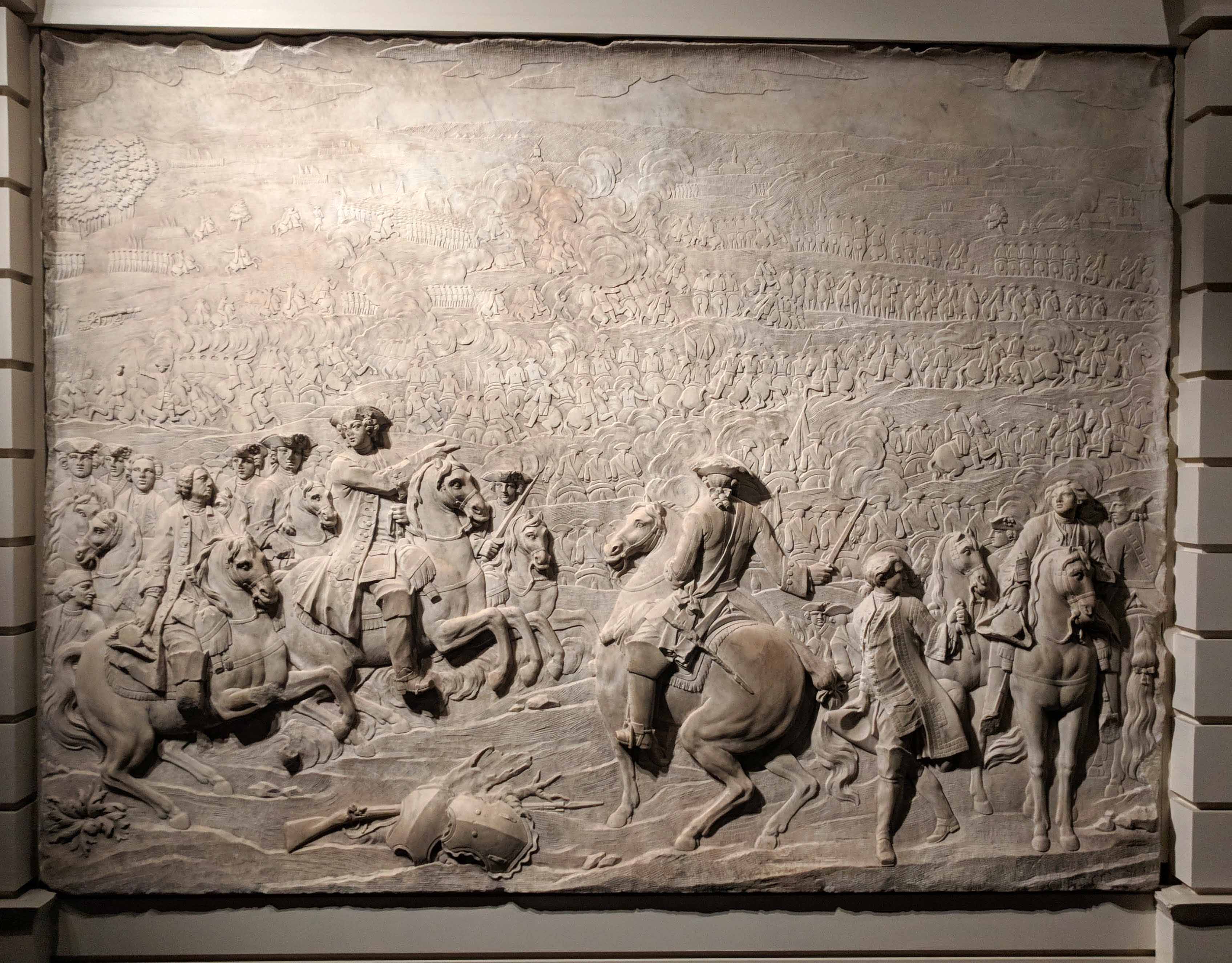 This bas-relief is a sculpted reproduction of Charles Parrocel’s painting of the battle of Fontenoy. The king is represented on horseback accompanied by his generals.
