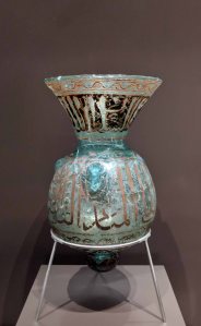 Votive oil lamps such as this one were made by eastern artisans to ornament mosques, and their edges were embellished with devotional epigraphic inscriptions. It entered the museum following Director Manuel Casamar’s trip to Egypt to acquire new pieces.
